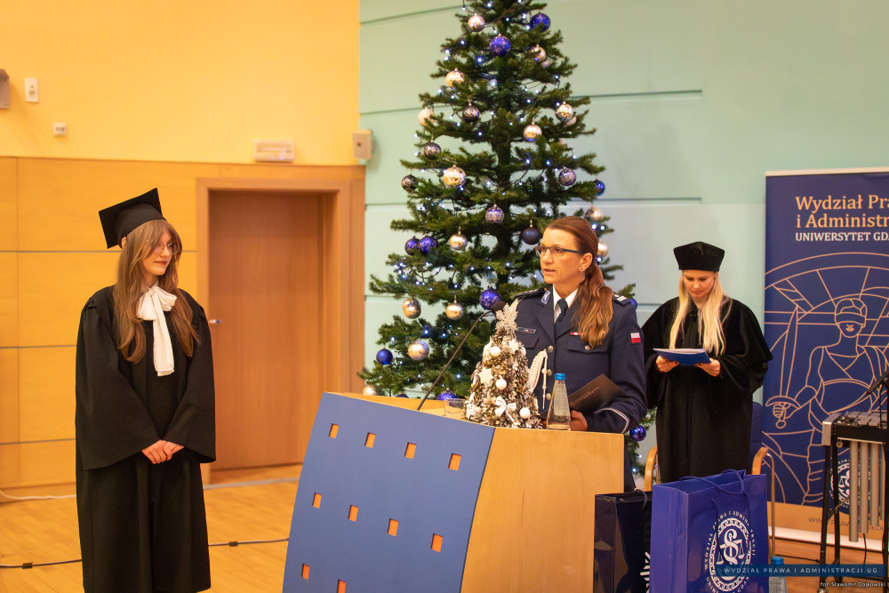 Następnie nadszedł moment uhonorowania tych, którzy spośród uczestników tegorocznego dyplomatorium uzyskali najwyższe średnie. Nagrody absolwentom kierunku Kryminologia wręczyła insp. Anna Kos, Zastępca Komendanta Wojewódzkiego Policji w Gdańsku.